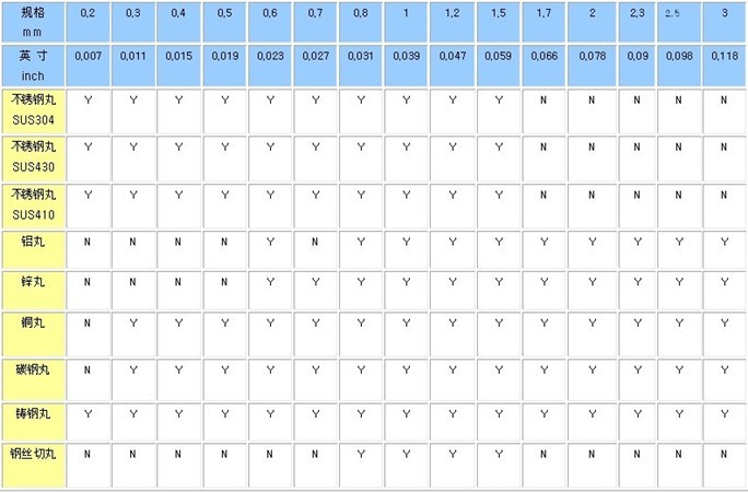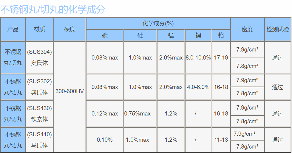 采用拉絲、裁切、磨圓等工藝精制而成。外觀(guān)光亮無(wú)銹,圓珠狀(切狀、圓狀)。廣泛用于應(yīng)用于銅、鋁、鋅、不銹鋼等工件的表面清理、去毛刺、強(qiáng)化及噴拋處理,對(duì)于加工后 的工件具有亞光效果,突出金屬本色,不生銹等特點(diǎn),無(wú)須進(jìn)行酸洗除銹處理而且耐磨度是鑄鋼丸的3-5倍,可以降低生產(chǎn)成本。目前該系列產(chǎn)品廣泛用于有色金屬鑄業(yè),汽車(chē)、摩托車(chē)、造船、航空、鋼板、鋼瓶、鋼結(jié)構(gòu)、冶金機(jī)械等領(lǐng)域的強(qiáng)化工藝處理。 可以提供的規(guī)格如下表: |